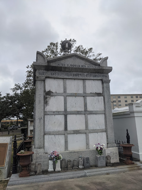 Another society tomb, but this one is for Slavonian immigrants. Society tombs like this functioned in a similar way as life insurance works today. Members would pay a small fee to join, then a small monthly fee to maintain their membership. Then in the event of a death the society would pay out to the widow to cover burial expenses and if the family lacked a tomb the deceased would be buried in the society tomb. You can check out the numbers and the small stone vases at the base with family names. If you look to your left, you can see a marker honoring Croatian veterans.